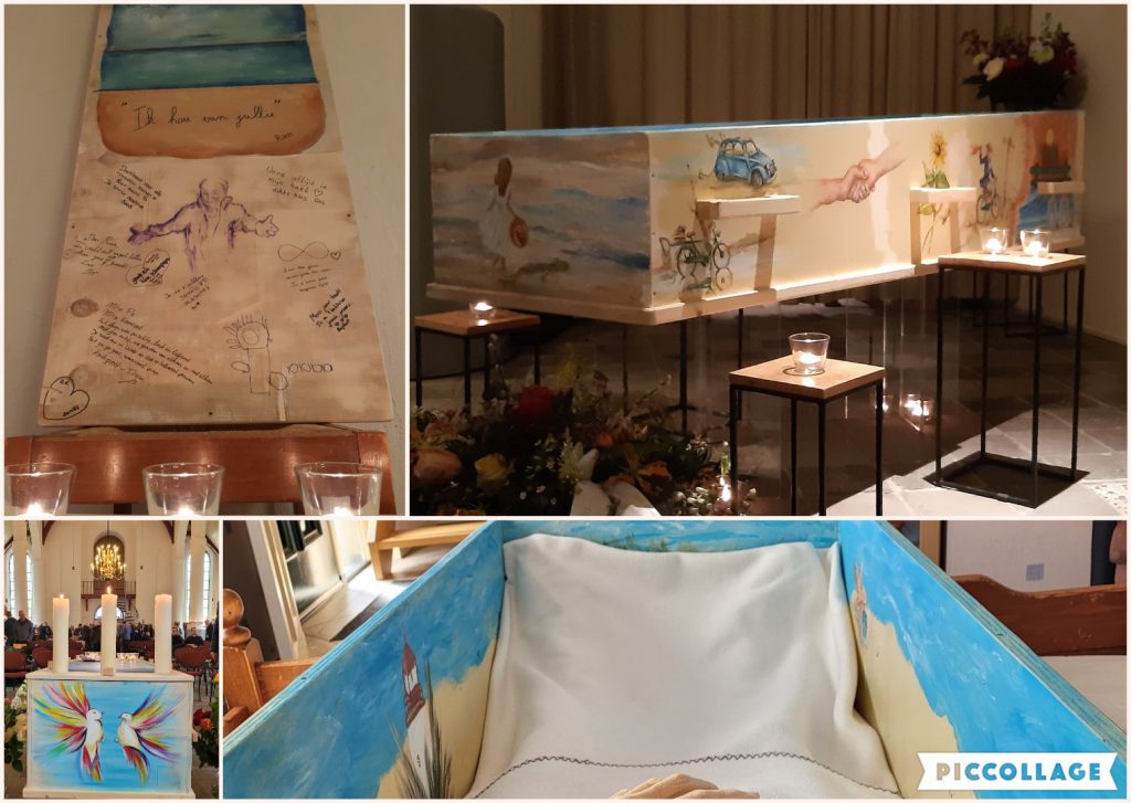 Rien was ziek en voelde dat hij niet lang meer te leven had. Een maand voor zijn overlijden kwam ik bij hem en zn vrouw langs om met elkaar kennis te maken en samen te praten over zijn uitvaartwensen. Aan het einde van het gesprek vertelde Rien dat hij de kist voor zijn laatste reis al klaar had staan in zijn schuur en hem graag aan mij wilde laten zien. Het was een kist die uniek was door de schilderingen die hij, met een beetje hulp, zowel aan de buiten- als binnenkant had gemaakt. Het woord kist dekt niet de lading, daarom noem ik het liever zijn laatste ‘reisjas’.