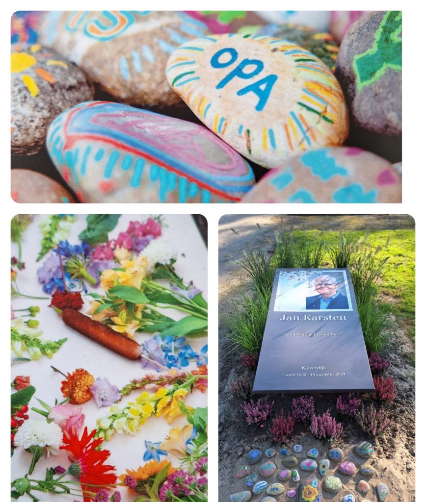 We lieten hem daar even alleen. Na de lunch keerden we namelijk als gezin weer terug naar zijn graf dat inmiddels was gesloten. Tijdens de lunch hadden we stenen, uit zijn eigen tuin, voorzien van tekeningen en teksten. Deze stenen legden we neer op zijn graf en de bloemen gaven we een mooi plekje. Dat was het moment dat we als gezin symbolisch de cirkel samen sloten.
