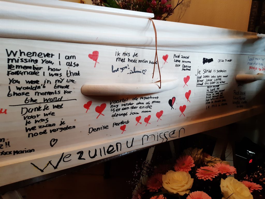 Van Renske hoefde er niet teveel poespas; “treur niet teveel om mij maar ga gewoon verder”. Maar dat ging niet helemaal gebeuren, ze verdiende veel meer. Renske was bijzonder door haar gewoon zijn en daarom verdiende ze ook gewoon een bijzonder afscheid. Haar kist was bijzonder; bijzonder door alle mooie teksten die erop geschreven waren door de mensen die haar dierbaar waren. Lieve, mooie teksten maar ook gekkigheid, want dat hoorde ook bij Renske.